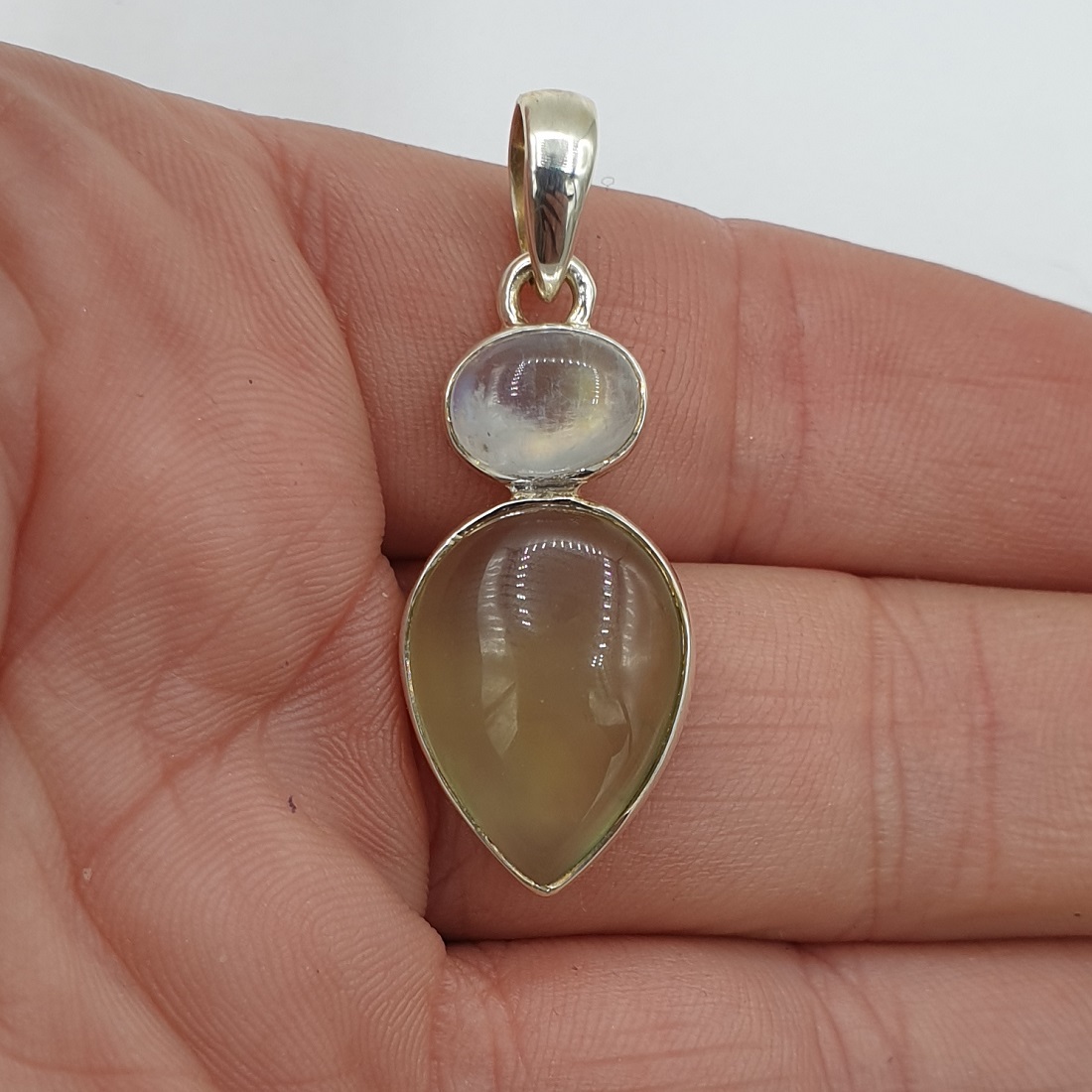 925 Sterling zilveren hanger gezet met Prehniet en regenboog Maansteen.