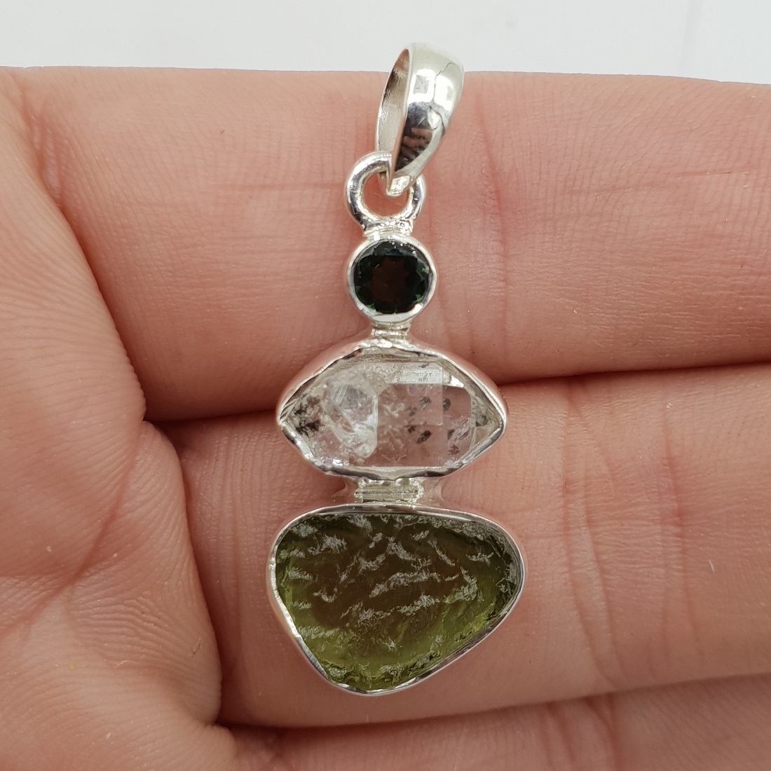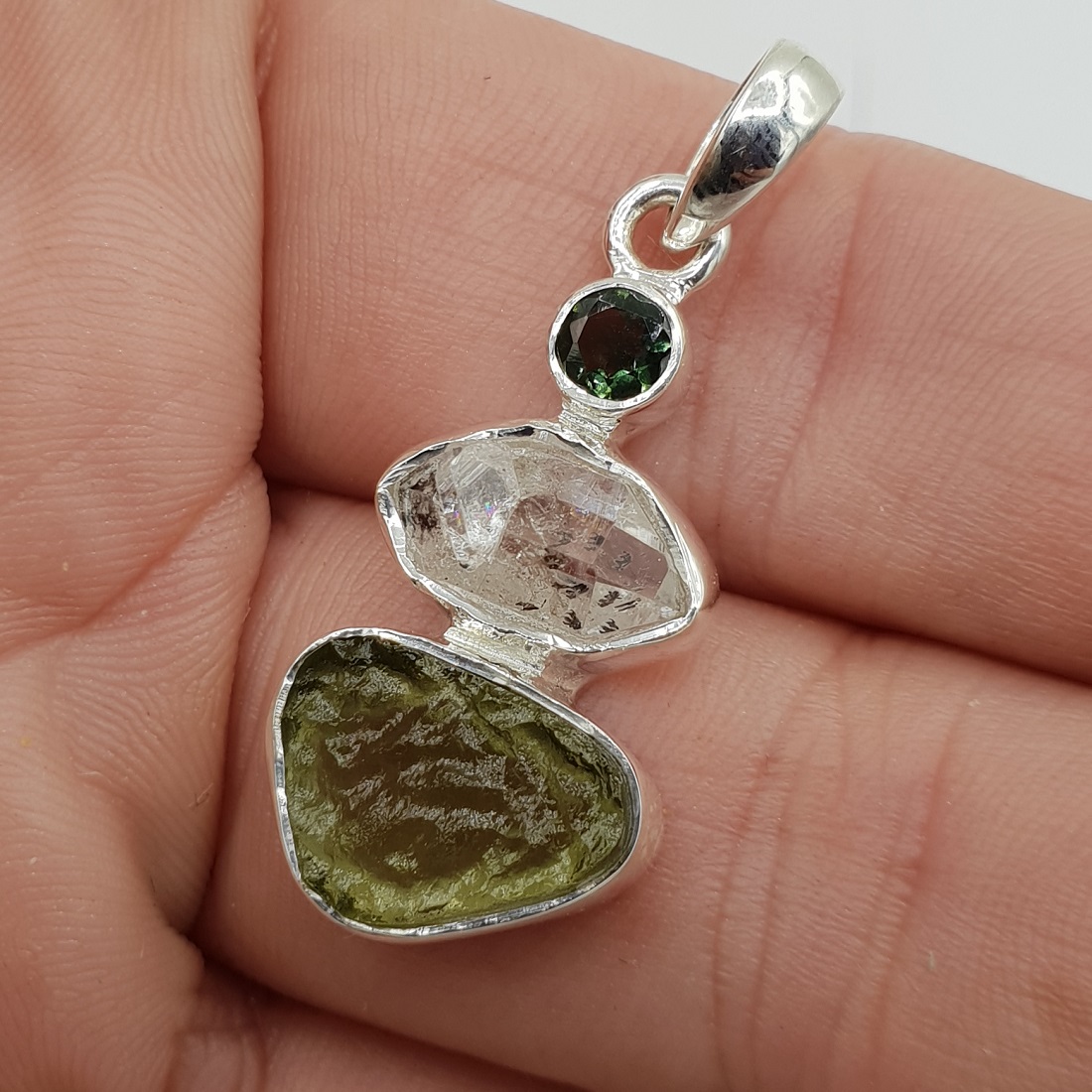925 Sterling zilveren hanger gezet met Moldaviet en Herkimer diamant.