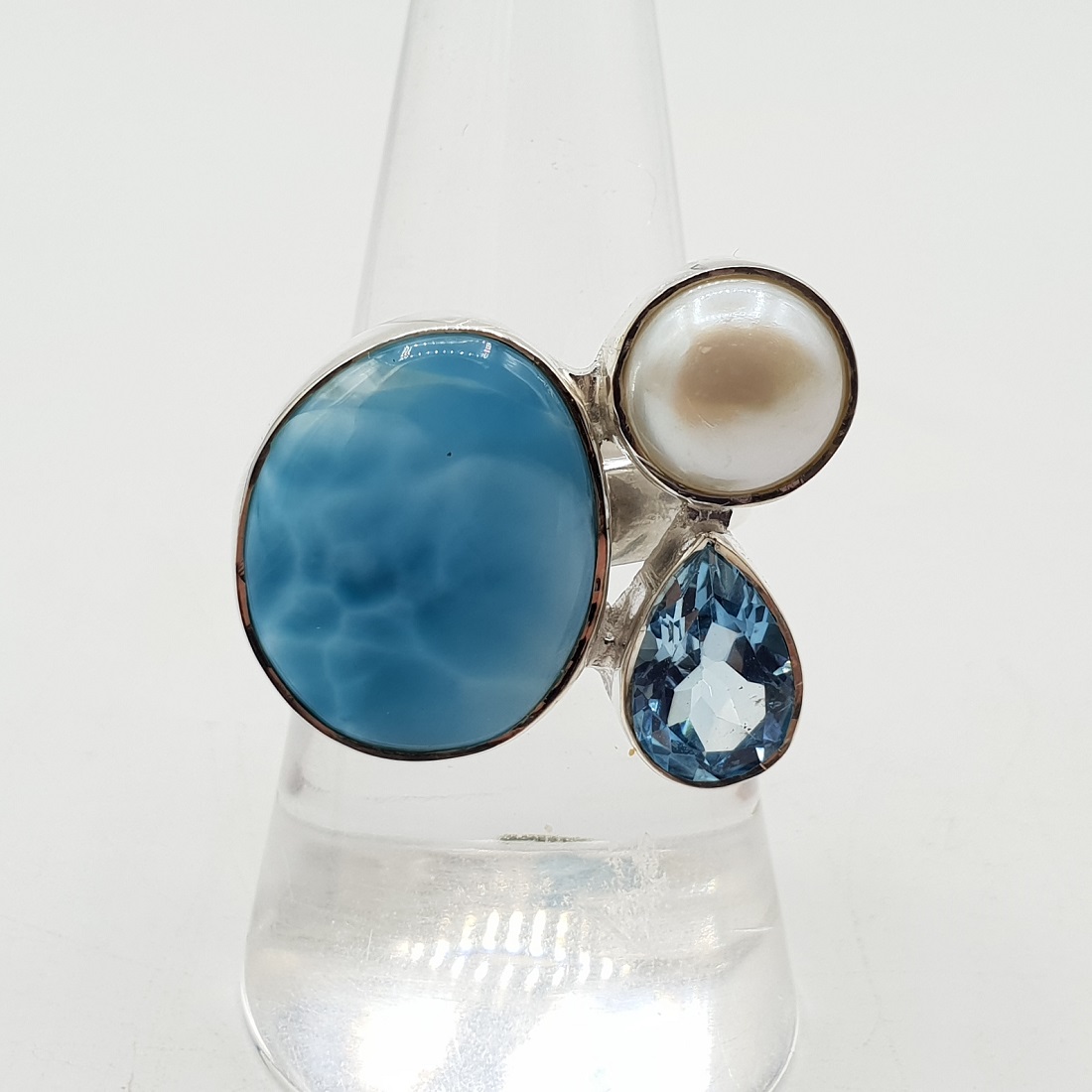 925 Sterling zilveren ring gezet met Larimar, blauw Topaas en Parel.
