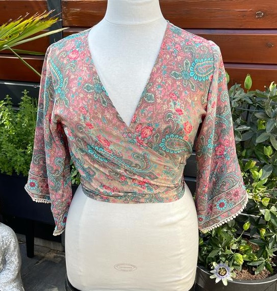 Deze top / vestje is op meerdere manieren te dragen als omslag of van voren met een knoop.