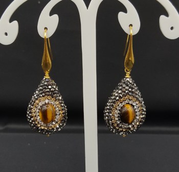 Vergulde oorbellen gezet met druppelvorm facet Tijgeroog