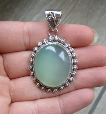 Zilveren edelsteen hanger met aqua Chalcedoon bewerkte setting