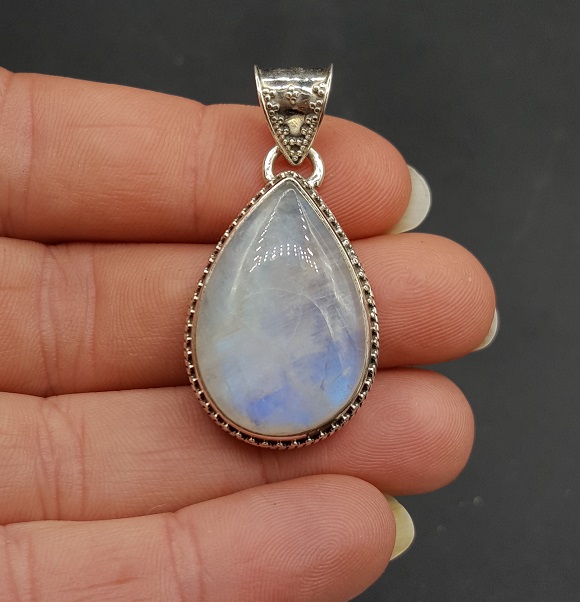 Mooie Sterling zilveren hanger met regenboog Maansteen gezet in bewerkte setting.