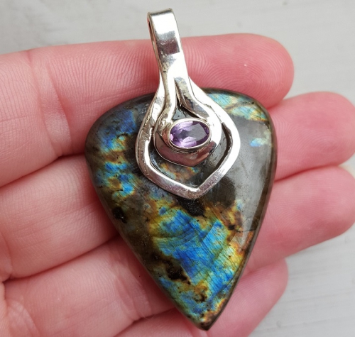 Mooie Sterling zilveren hanger gezet met Labradoriet en Amethist.