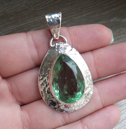 Mooie Sterling zilveren hanger met facet geslepen groene Fluoriet in gehamerde setting.