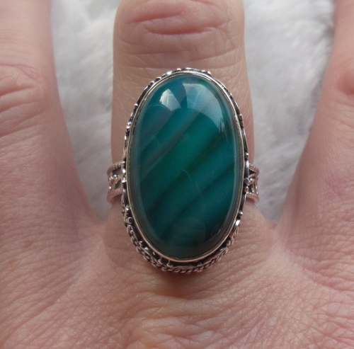 Mooie Sterling zilveren ring met blauw / groene Botswana Agaat gezet in bewerkte setting.