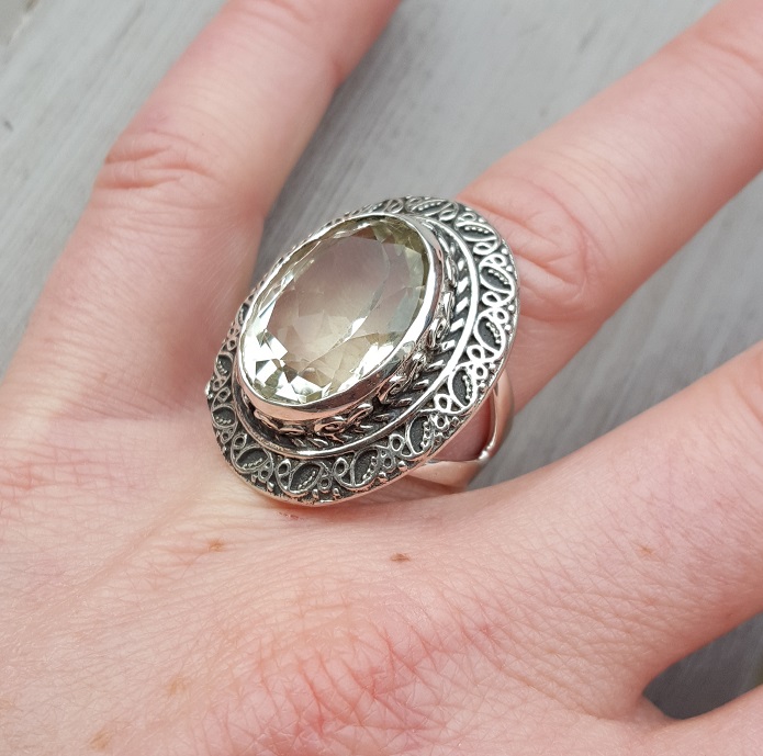 Zilveren ring met groene Amethist en bewerkte kop 17.5 mm