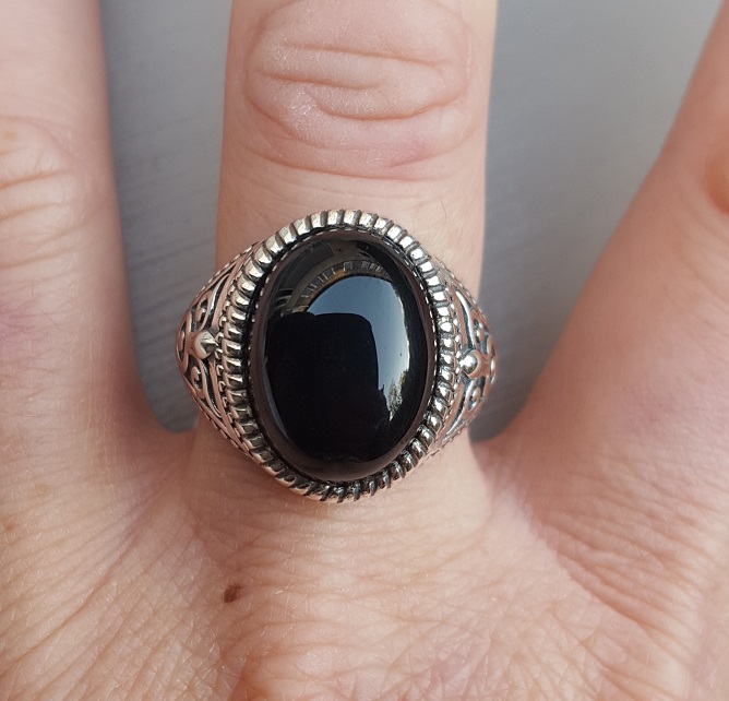Mooie Sterling zilveren ring gezet met zwarte Onyx. Deze zilveren ring heeft ring maat 20 mm.