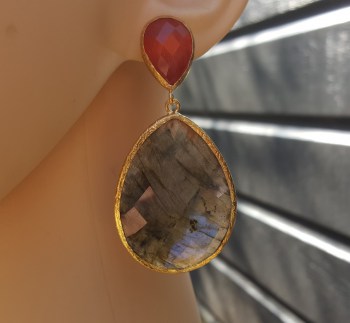 Mooie 24K goud vergulde (over messing) oorbellen met oranje Kattenoog en Labradoriet.