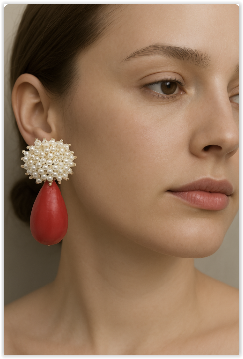 Vergulde oorbellen rode katoen parel en ooknop van kraaltjes