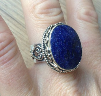 Mooie Sterling zilveren ring met Saffier in bewerkte setting. De kop van deze zilveren ring heeft een afmeting van 2.3 cm x 1.7 cm. Deze zilveren ring heeft ring maat 19 mm.