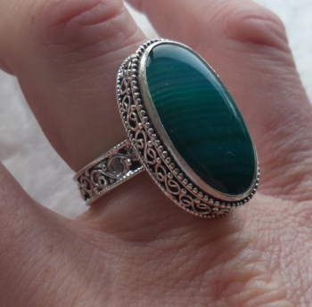 Mooie Sterling zilveren ring met blauw / groene Botswana Agaat gezet in bewerkte setting. De kop van deze zilveren ring heeft een afmeting van 2.5 cm x 1.5 cm. Deze zilveren ring heeft ring maat 17.5 mm.