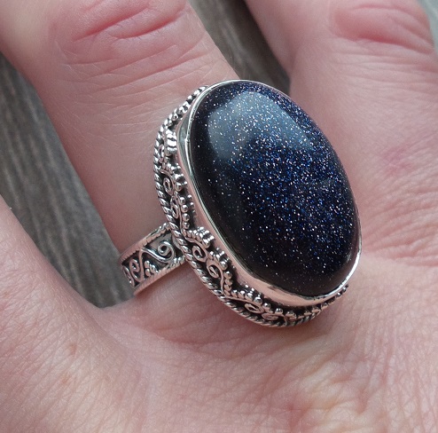 Mooie Sterling zilveren ring gezet met blauwe Goudsteen in bewerkte setting.