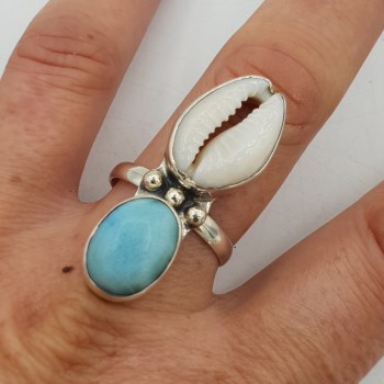 Zilveren ring gezet met Cowrie schelp en Larimar 19.5 mm