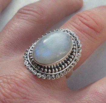 Mooie Sterling zilveren ring gezet met regenboog Maansteen. De kop van deze zilveren ring heeft een lente van 2.6 cm. Deze zilveren ring heeft ring maat 18 mm.