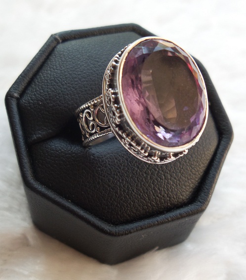 Mooie Sterling zilveren ring gezet met Amethist in bewerkte setting.